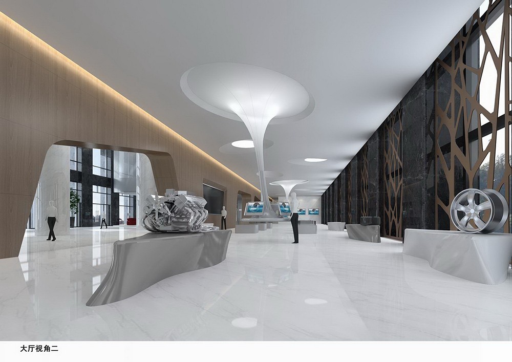 本案整體設(shè)計風(fēng)格具有現(xiàn)代科技感,流線設(shè)計簡約,個性鮮明,造型不可復(fù)制性,決定企業(yè)價格觀與品牌文化的唯一性,設(shè)計大膽運用曲面設(shè)計手法。大量的使木紋鋁板裝飾、天石材等高檔材料,運用到整個理念之中。一氣呵成,呈現(xiàn)完美的空間視覺